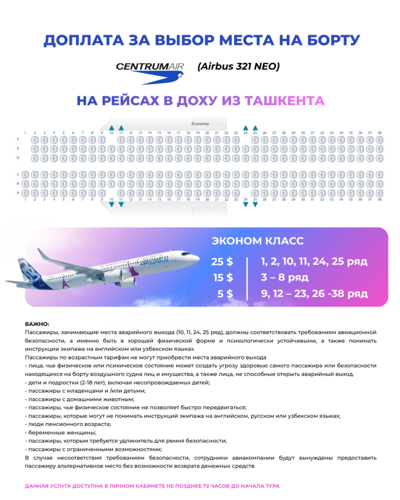 Доплата за выбор места на борту а/к Centrum Air (Airbus A320) на рейсах в Доху из Ташкента