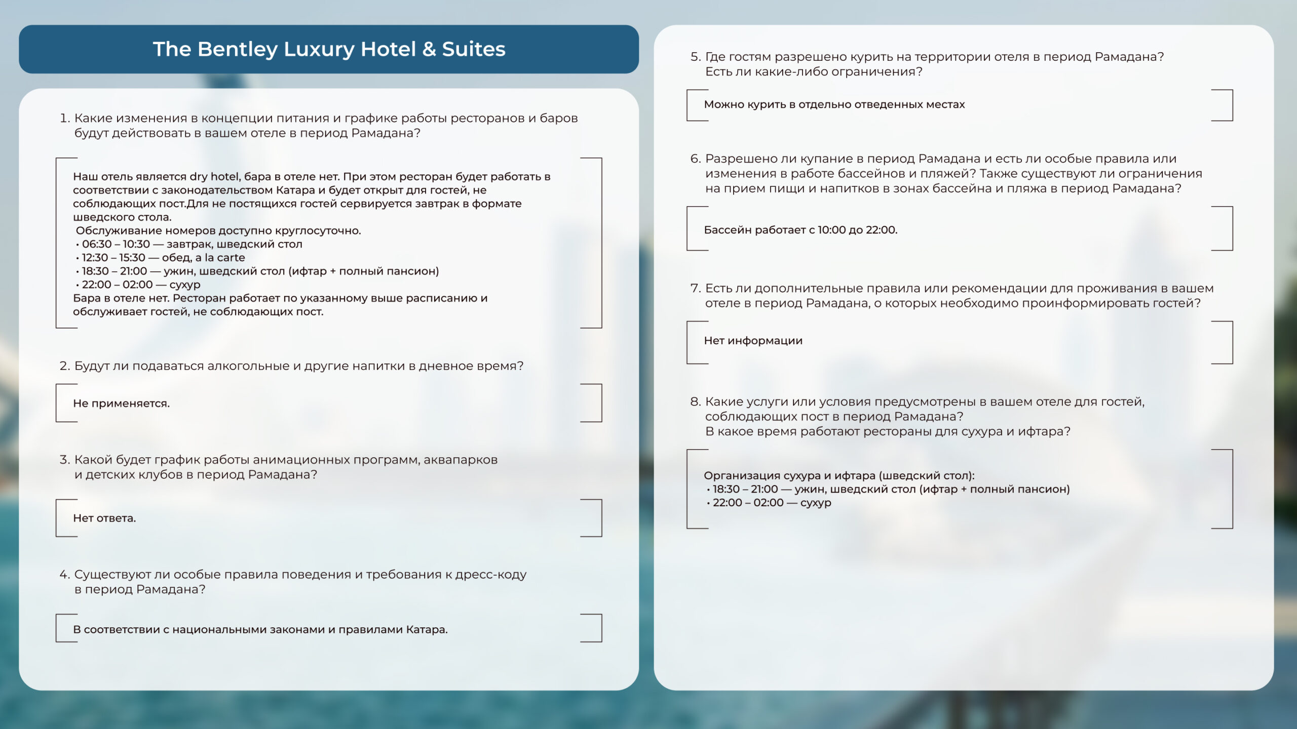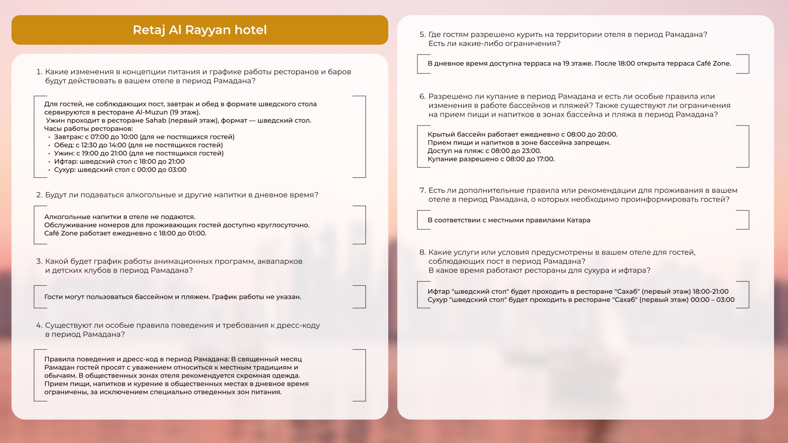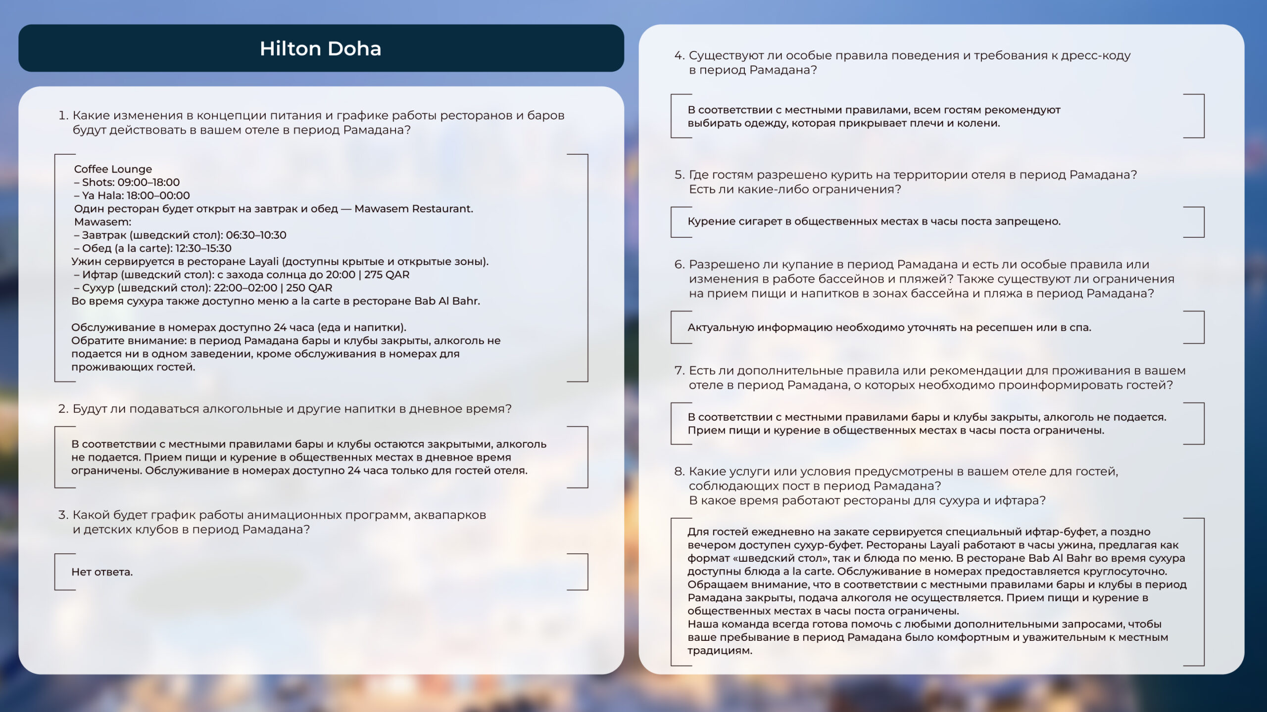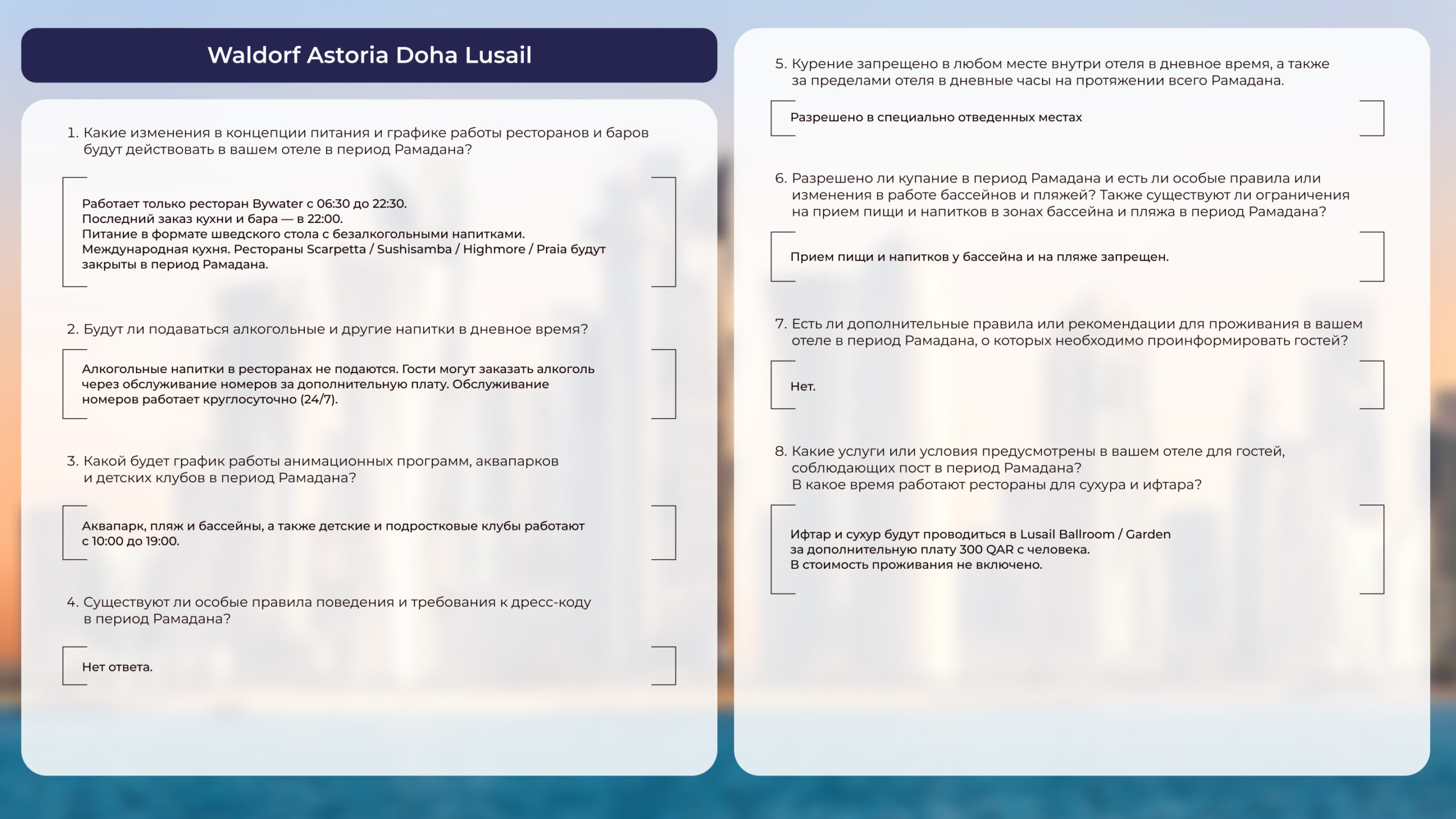Чтобы вам было комфортно, предлагаем познакомиться с ответами на частозадаваемые вопросы об отдыхе в Катаре в этот период: